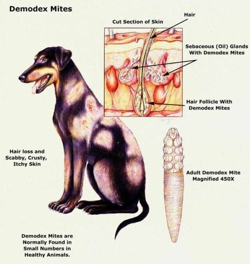 Demodex: Demodex of jonge hondenschurft is een mijt die van nature voorkomt in de huid van de hond. Bij jonge honden en honden met minder weerstand kan hij zich ongebreideld uitbreiden en irritatie veroorzaken. Demodicose is vaak gelokaliseerd op de kop en de poten. Het begint met kale, wat rode plekjes die kunnen jeuken. Af en toe blijft de jeuk achterwege. In een later stadium kunnen er korstjes ontstaan en kan de huid schilferen. Af en toe is er sprake van uitgebreide kaalheid en ontsteking, die gepaard gaan met veel jeuk.